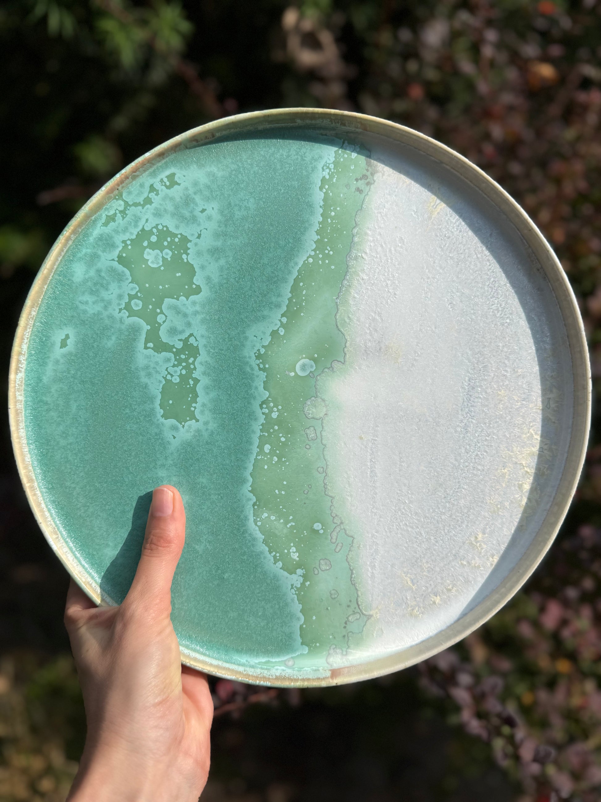 Piękna, ręcznie formowany talerz z białej kamionki. Idealny do serwowania wszelkich dań, każde będzie się pięknie prezentować w tym unikalnym naczyniu. Turkusowo-białe szkliwa przypominające piękną głębie oceanu.