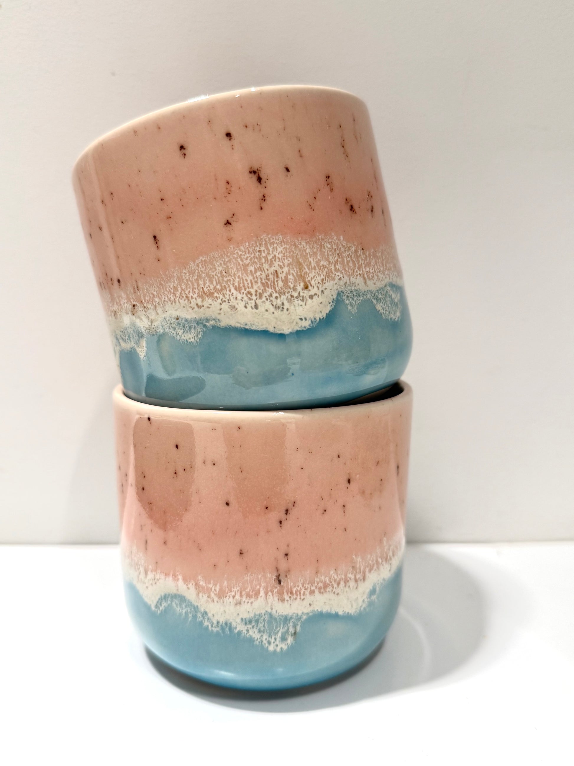 Ręcznie wykonany kubek z wysokiej jakości białej gliny, szkliwiony bezołowiowymi i wegańskimi szkliwami. Dwukrotnie wypalany do temperatury 1250 C, co sprawia, że każdy egzemplarz jest bezpieczny i trwały.